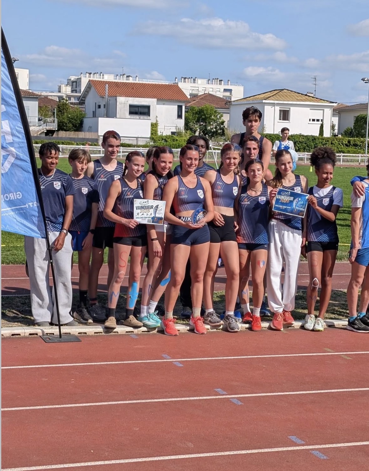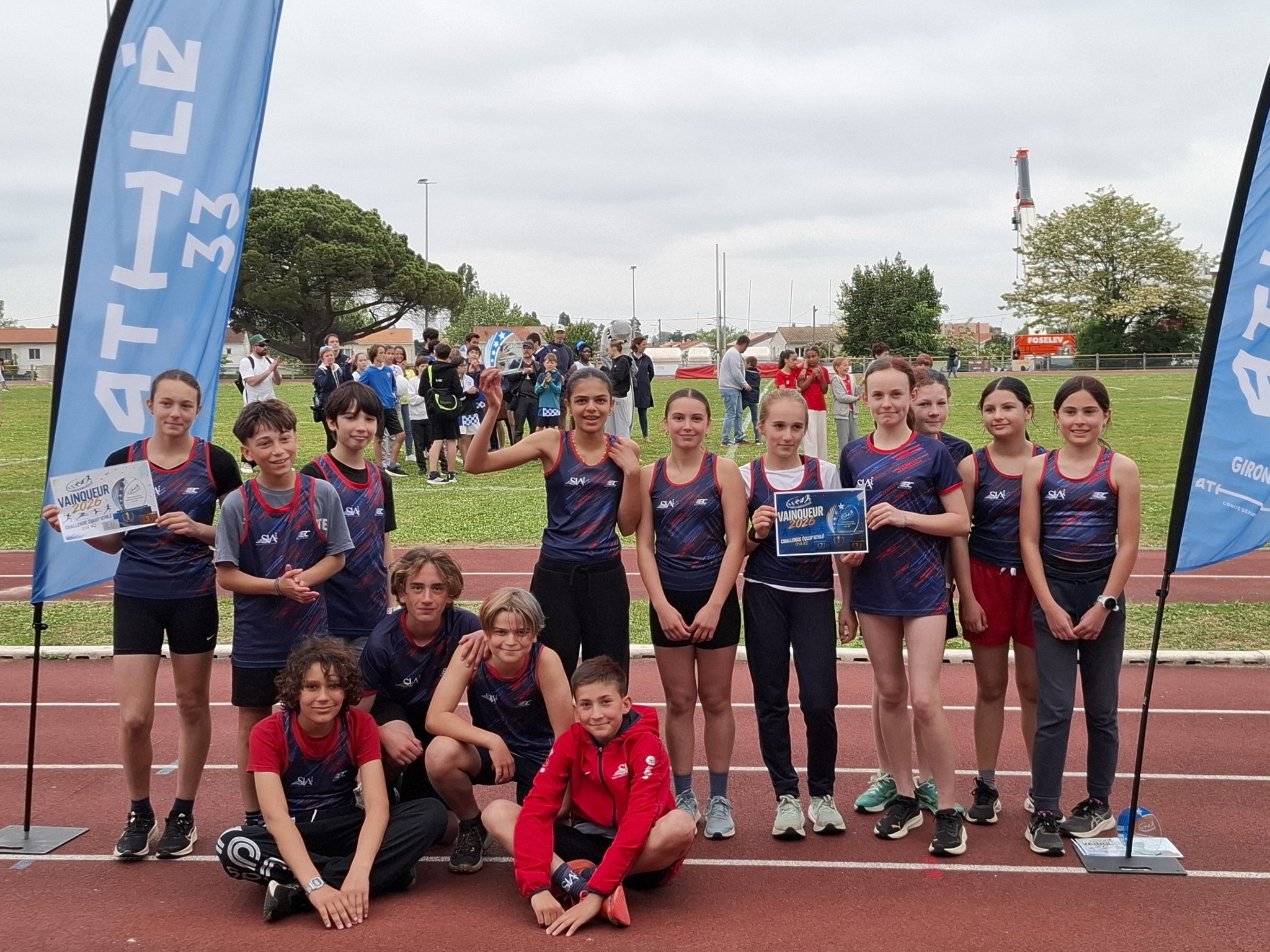 U14 N1 : Le Stade Bordelais Athlétisme remporte la bataille avec 460 points contre les 2 équipes de l’US Talence avec 423 et 237 points.