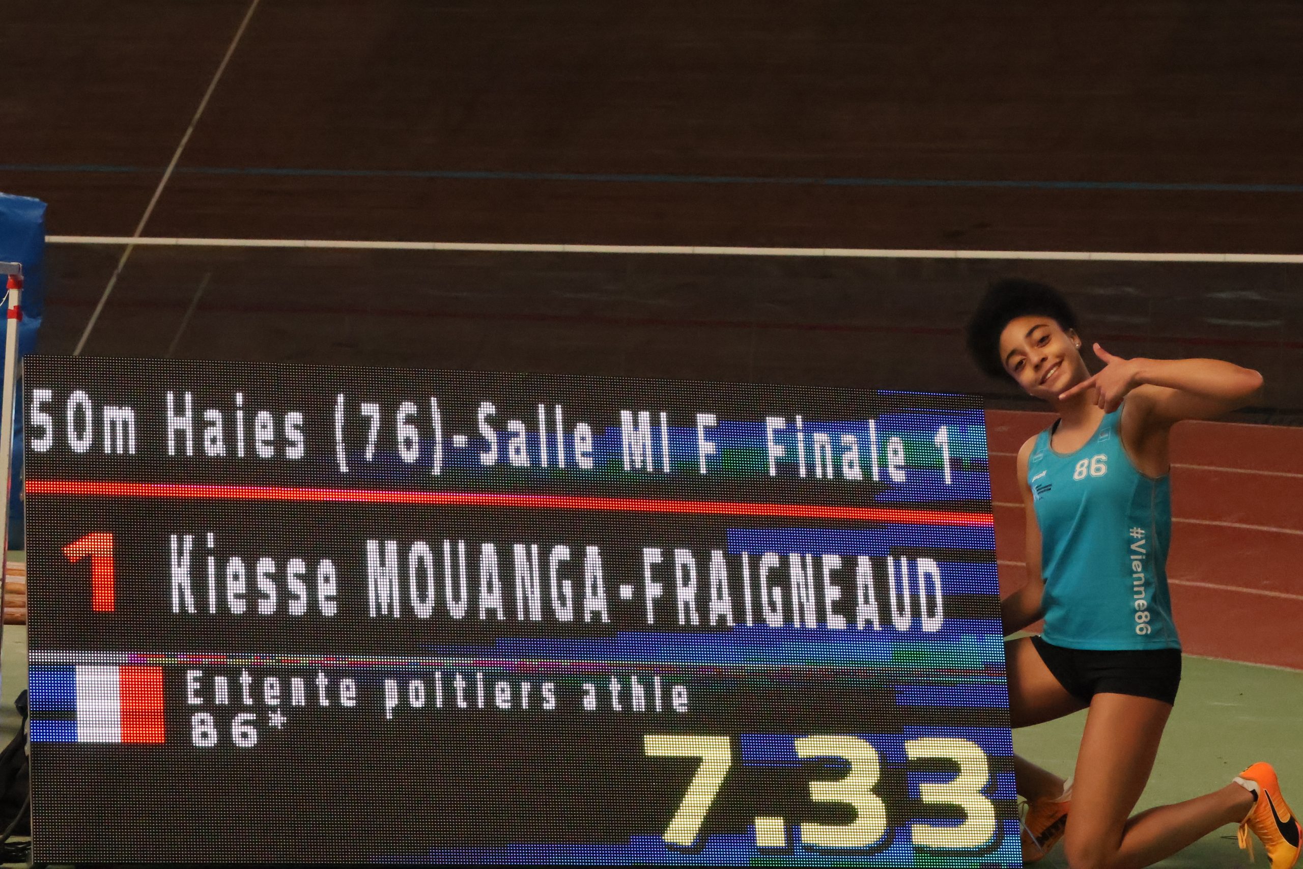 Chez les minimes, une performance exceptionnelle est à souligner avec Kiéssé MOUANGA (Entente Poitiers Athlétisme 86), qui améliore de nouveau son record de France, déjà battu le week-end dernier, avec 7″33 (50 points) sur 50 m haies. Elle réalise également 6″77 (43 points) sur 50 m et 5,32 m (41 points) en longueur, ce qui lui permet d’atteindre 134 points au triathlon, son nouveau record.